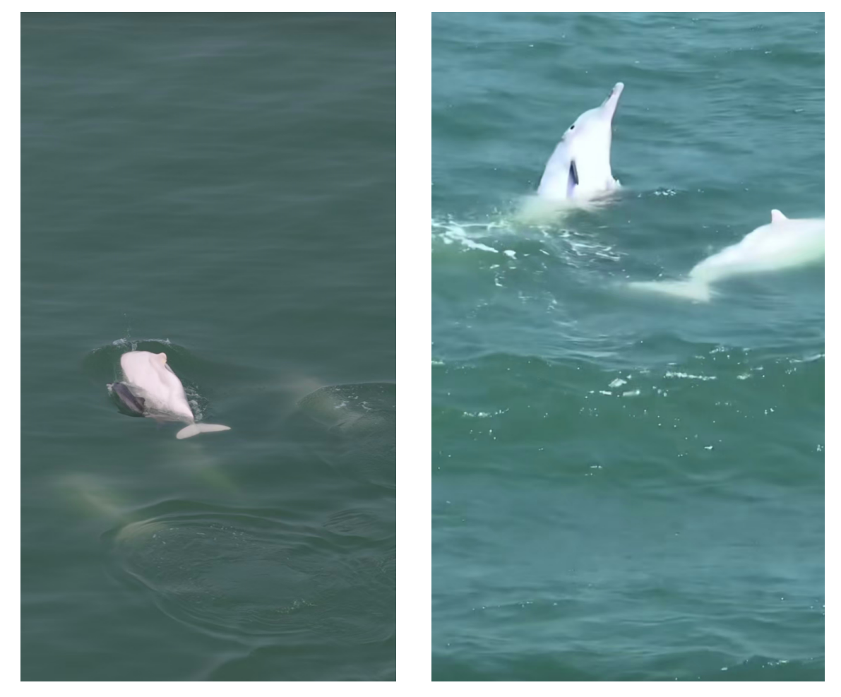 白海豚视频截图。左图为2026年4月拍摄于厦门西海域,右图为2025年5月拍摄于厦门同安湾五缘湾段附近海域。陈春玲供图