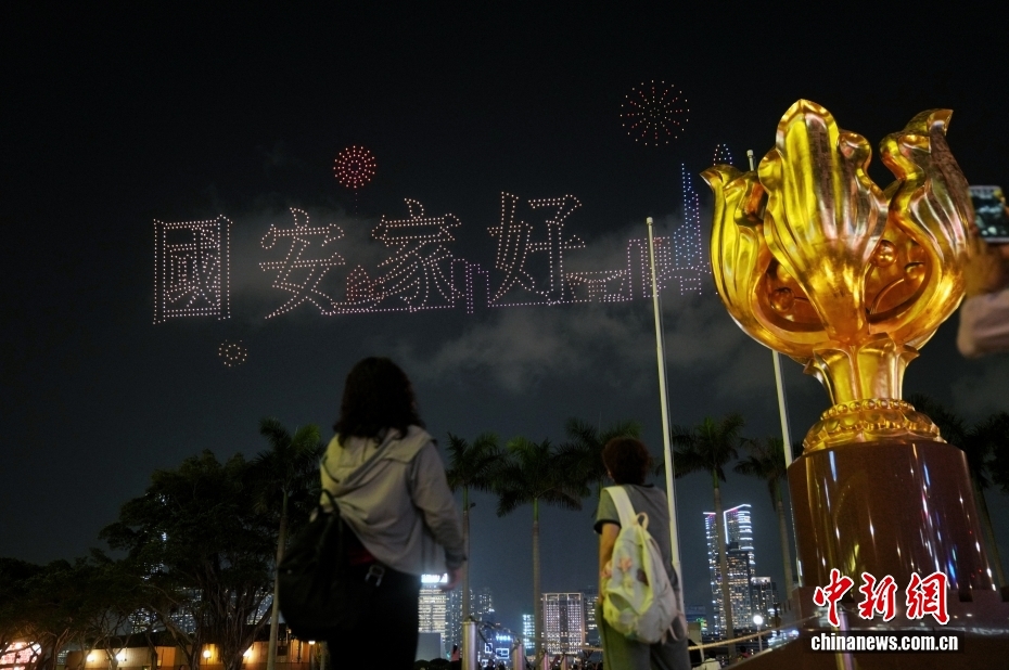 4月15日是第十一个全民国家安全教育日,2026架无人机点亮香港维多利亚港上空,以十幕融合立体技术与动态灯光效果的光影篇章,演绎国家安全的丰富内涵,吸引市民游客观看。图为无人机展示“国安家好”字样。