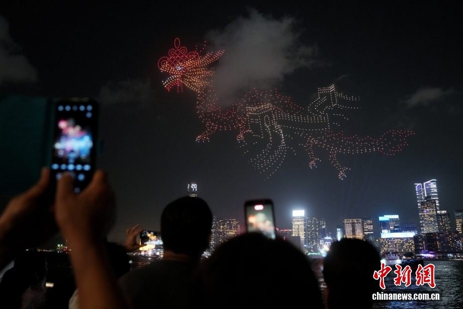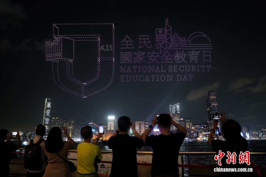 4月15日是第十一个全民国家安全教育日,2026架无人机点亮香港维多利亚港上空,以十幕融合立体技术与动态灯光效果的光影篇章,演绎国家安全的丰富内涵,吸引市民游客观看。图为无人机展示“国安家好”字样。